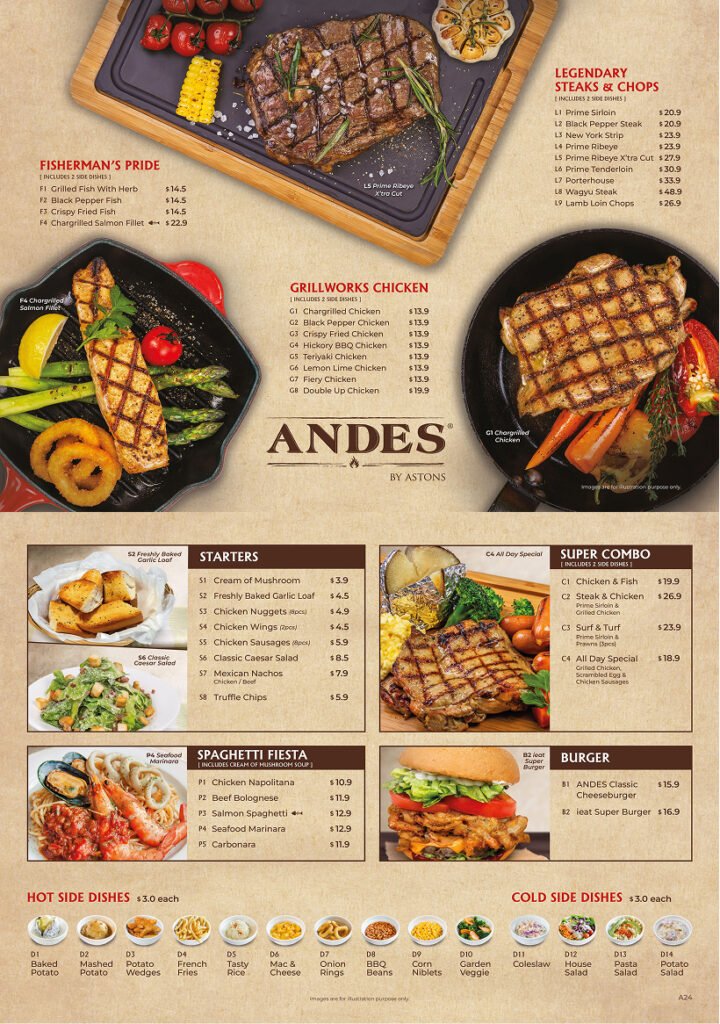 Being halal-certified and MUIS-accredited, ANDES is the answer to the calling of our Muslim friends for scrumptious and affordable steaks and western cuisine in Singapore. An alter-ego of ASTONS Specialities where the menu is almost identical, ANDES uses the same high quality and fresh ingredients to serve up generous portions of food to our customers.